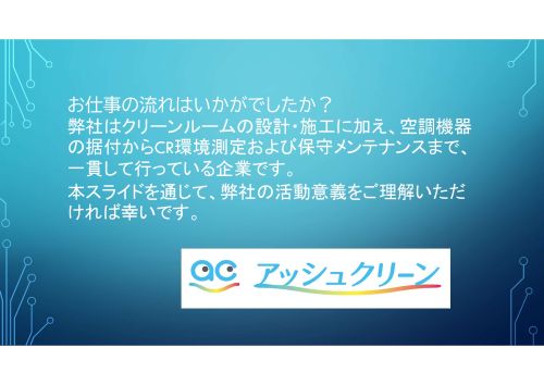 お仕事の流れはいかがでしたか? 弊社はクリーンルームの設計・施工に加え、空調機器の据付からCR環境測定、および保守メンテナンスまで一貫して行っている企業です。 本スライドを通じて、弊社の活動意義をご理解いただければ幸いです。