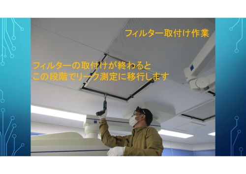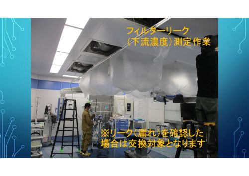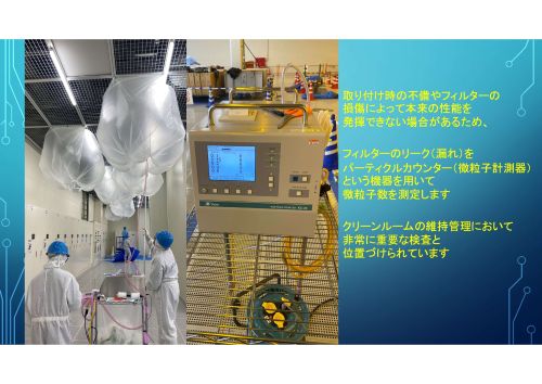 取り付け時の不備や、フィルター損傷によって本来の性能を発揮できない場合もあるため、フィルターのリーク(漏れ)をパーティクルカウンター(微粒子計測器)という機器を用いて微粒子数を測定します。 クリーンルームの維持管理において非常に重要な検査と位置づけられています。
