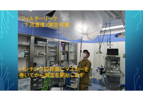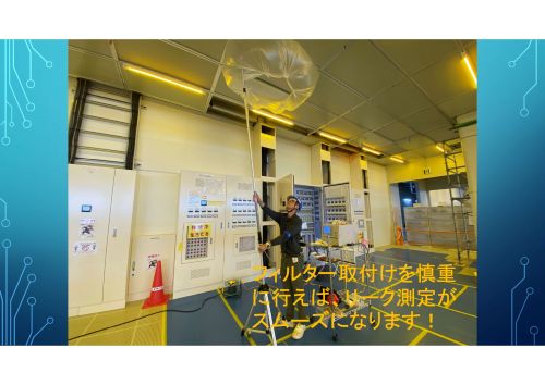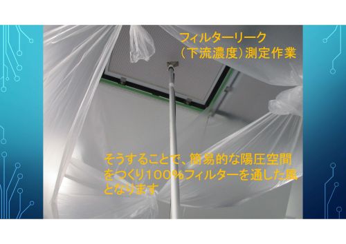 フィルターリーク(下流濃度)測定作業。 そうすることで、簡易的な陽圧空間をつくり、100%フィルターを通した風となります。