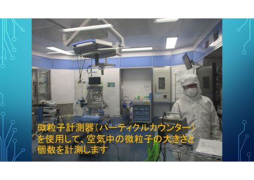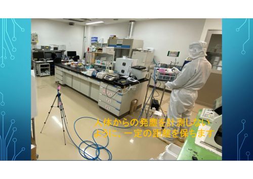 微粒子計測器(パーティクルカウンター)を使用して、空気中の微粒子の大きさと個数を計測します。