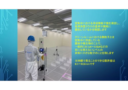 空気中における浮遊微粒子数を測定し、各清浄度クラスの基準や規格に適合しているかを確認します。 クリーンルームにおける微粒子とは空気中に浮遊している塵埃や微生物のことで、一般的に0.1μm〜0.5μmなどの目には見えないレベルの非常に小さな粒子のことを指します。 ※肉眼で見ることのできる限界値は0.1〜0.2mmです。